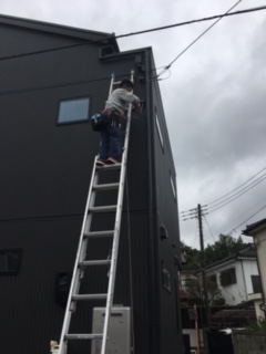 ベテラン職人の又さん、デザインアンテナ取り付けの最適な位置と角度を探す為レベルチェッカーで電波のレベルと質を測定します。