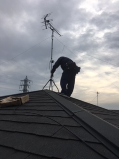 アンテナ工事は八木式を3階の屋根上に3段梯子で次郎さん登っていきます。